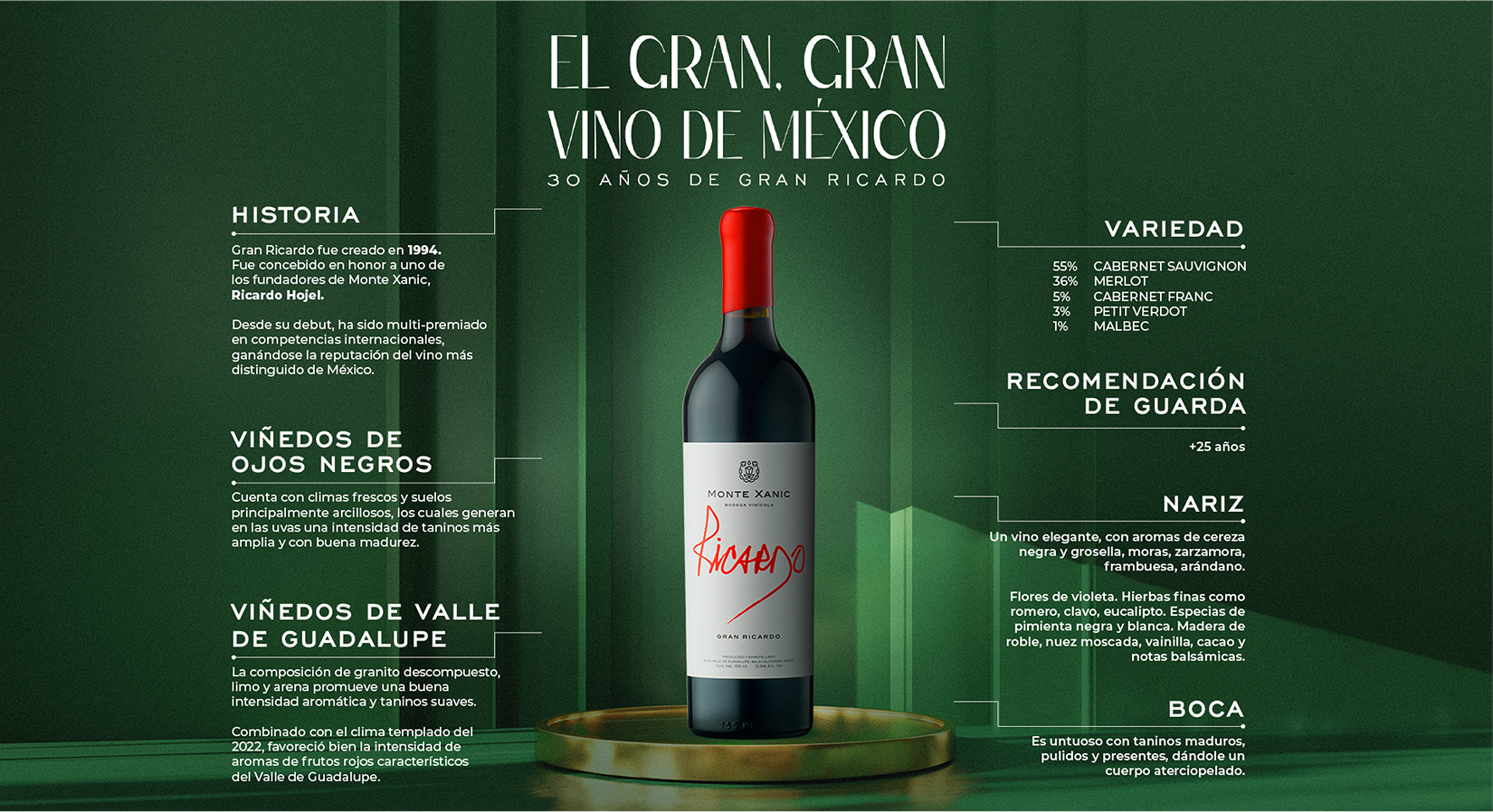Gran Ricardo fue creado en 1994 y desde entonces, representa lo más selecto de nuestra oferta vinícola. Concebido en honor a uno de los fundadores de Monte Xanic, Ricardo Hojel, este vino de alta gama ha sido multipremiado en competencias internacionales, ganándose la reputación del vino más distinguido de México. Es el máximo exponente del vino mexicano en su categoría, destacando por su personalidad, carácter y un alto potencial de guarda (+25 años).